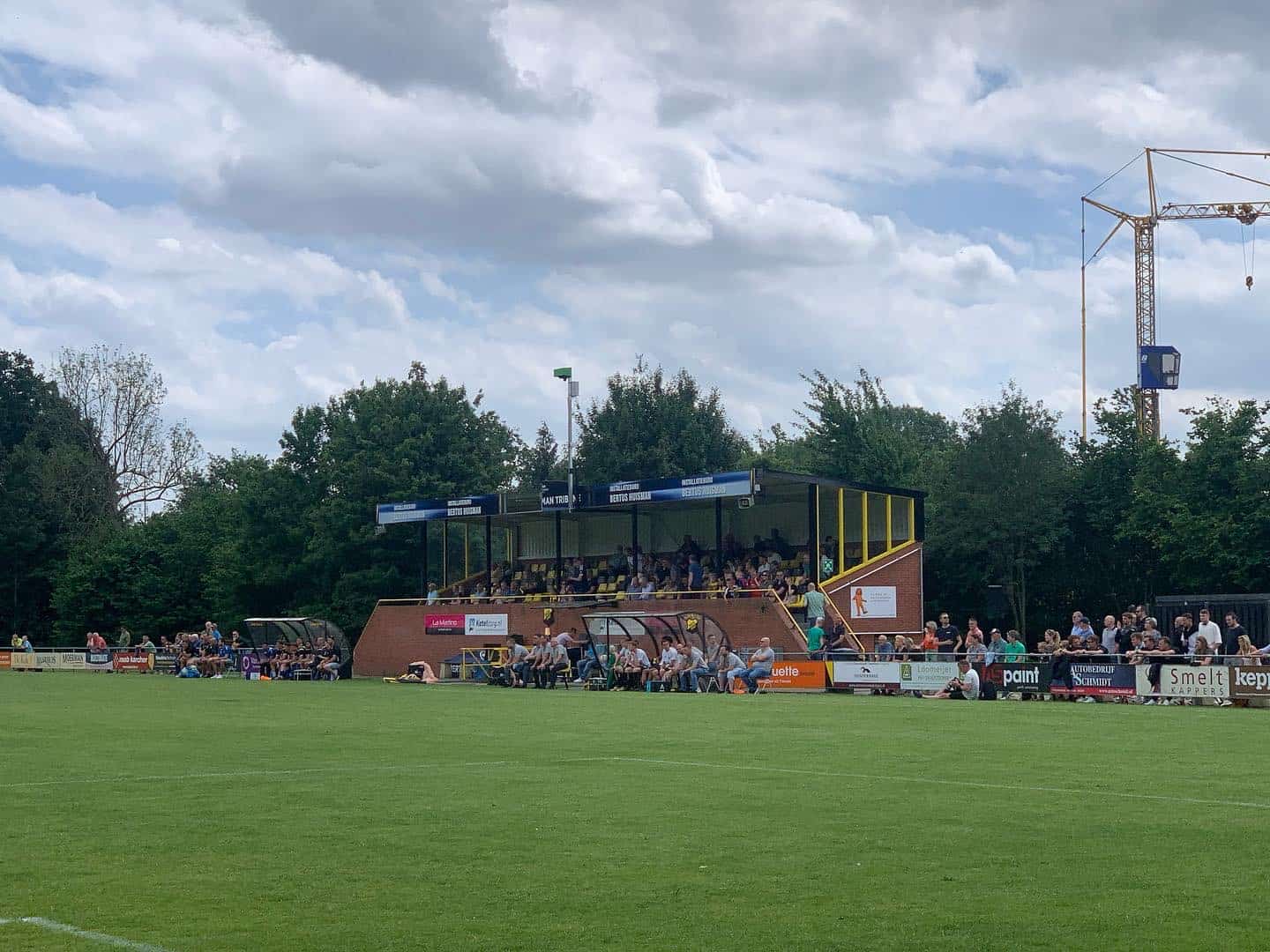 Voor ons een mooi moment om het sportpark eens rond te lopen. De lange zijde kent een zit tribune met ongeveer 200 zitplaatsen verdeeld over zes rijen. Ondanks dat een deel van de benaming van het tribune is weggevallen vermoeden we dat het de Bertus Huisman tribune is. Naast de tribune staat iets naar achteren een antreciet grijs hok waar, volgend de bordjes, de materiaalman zijn domein heeft. Weer een stukje verder, in het verlengde van de cornervlag staat een nieuw hoofdgebouw waar onder andere de kantine zich bevindt maar waar ook een terras is van waaraf aanwezigen de wedstrijd kunnen bekijken. Geen lekkere positie voor goed overzicht zo in het verlengde van de cornervlag, maar waarschijnlijk wel een prima plek om zaken te doen. Die slaan we dus even over.