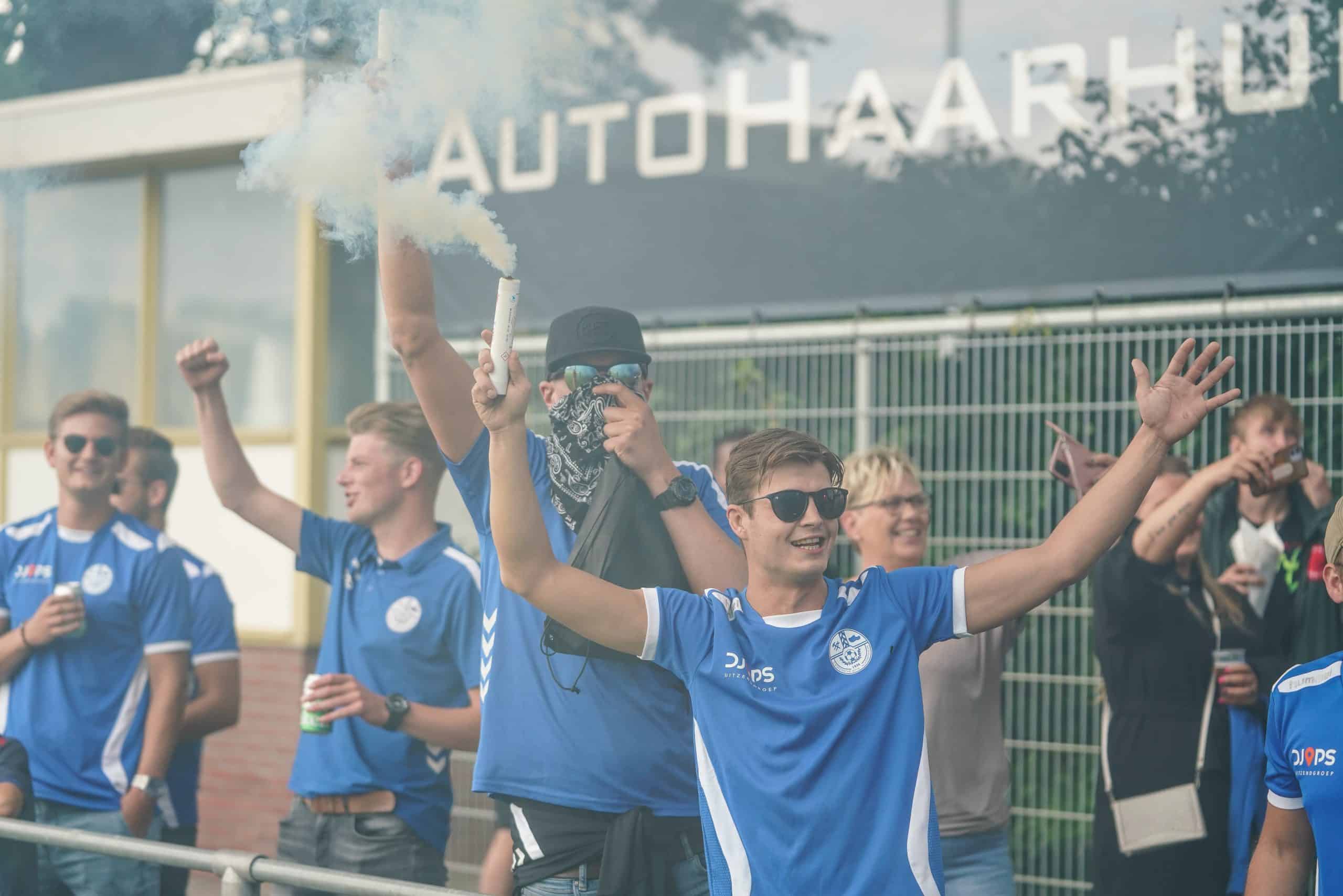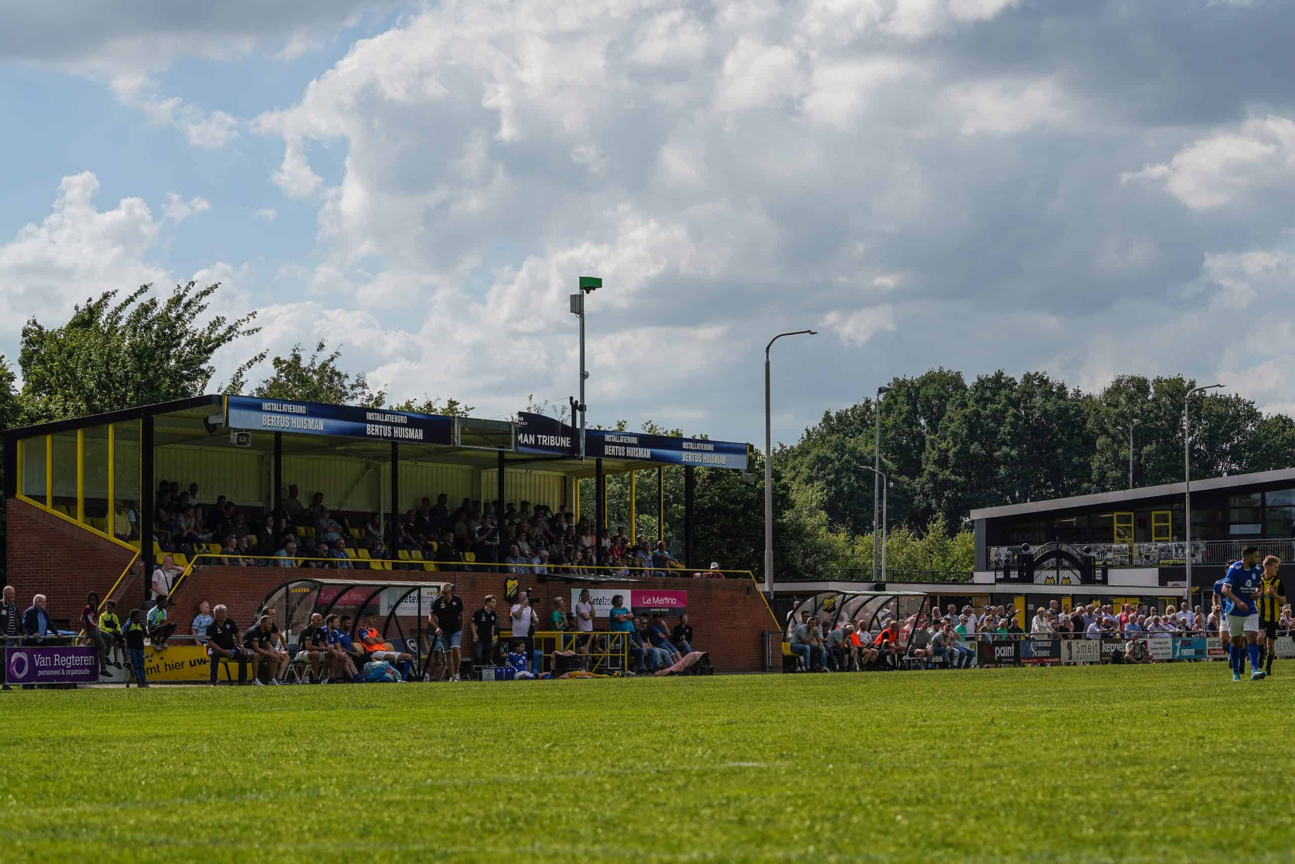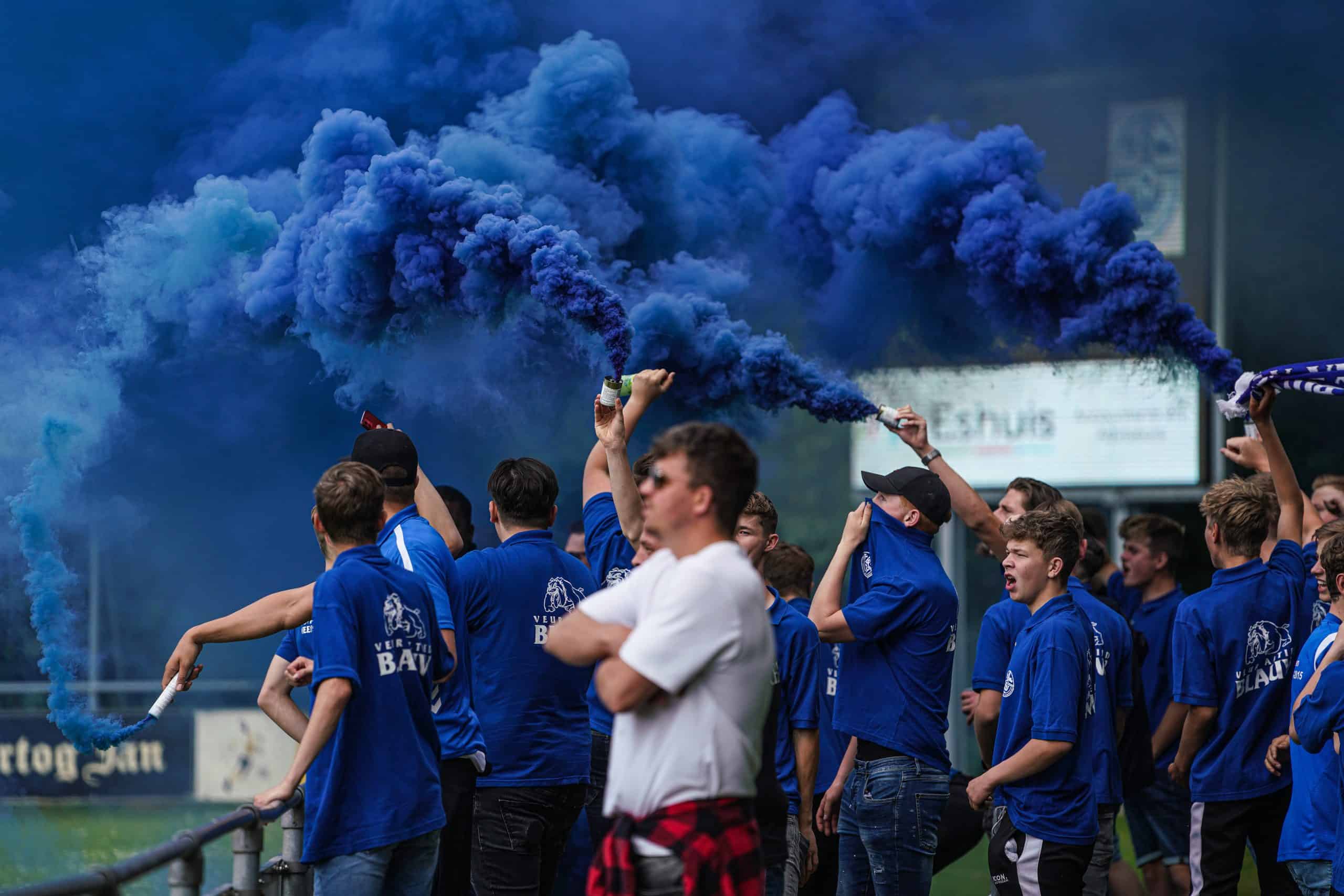 Vijf minuten voor de aftrap draaien we de Boerhavelaan op. De spelersbus van Veensche Boys en een touringcar gehuurd door de Veensche Ultras ‘Blauwe Helden’ staan gebroederlijk naast elkaar op de parkeerplaats. We lopen langs de rood zwarte kleuren van DETO Twenterand. De zaterdag hoofdklasser is de tweede bespeler van sportpark Het Midden. Het geluid brengt ons al snel de andere kant op, naar het gele deel van het sportpark.
