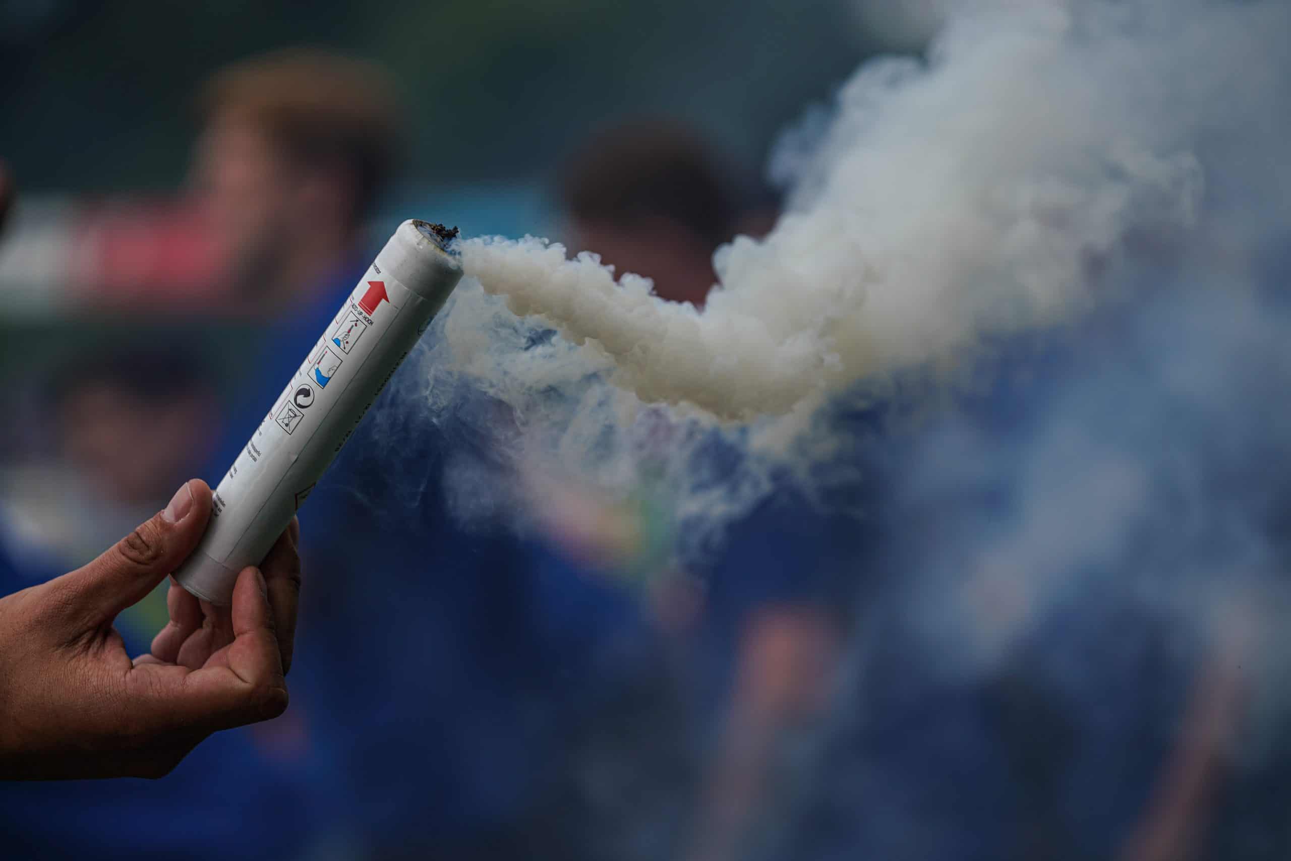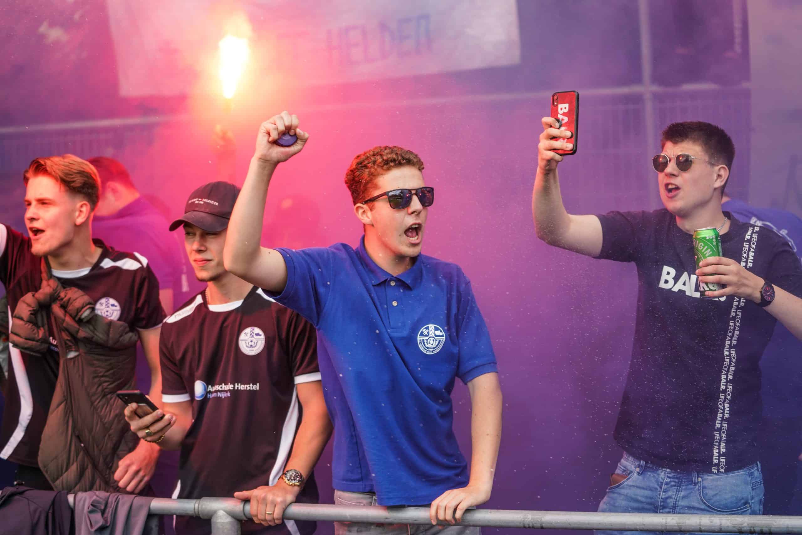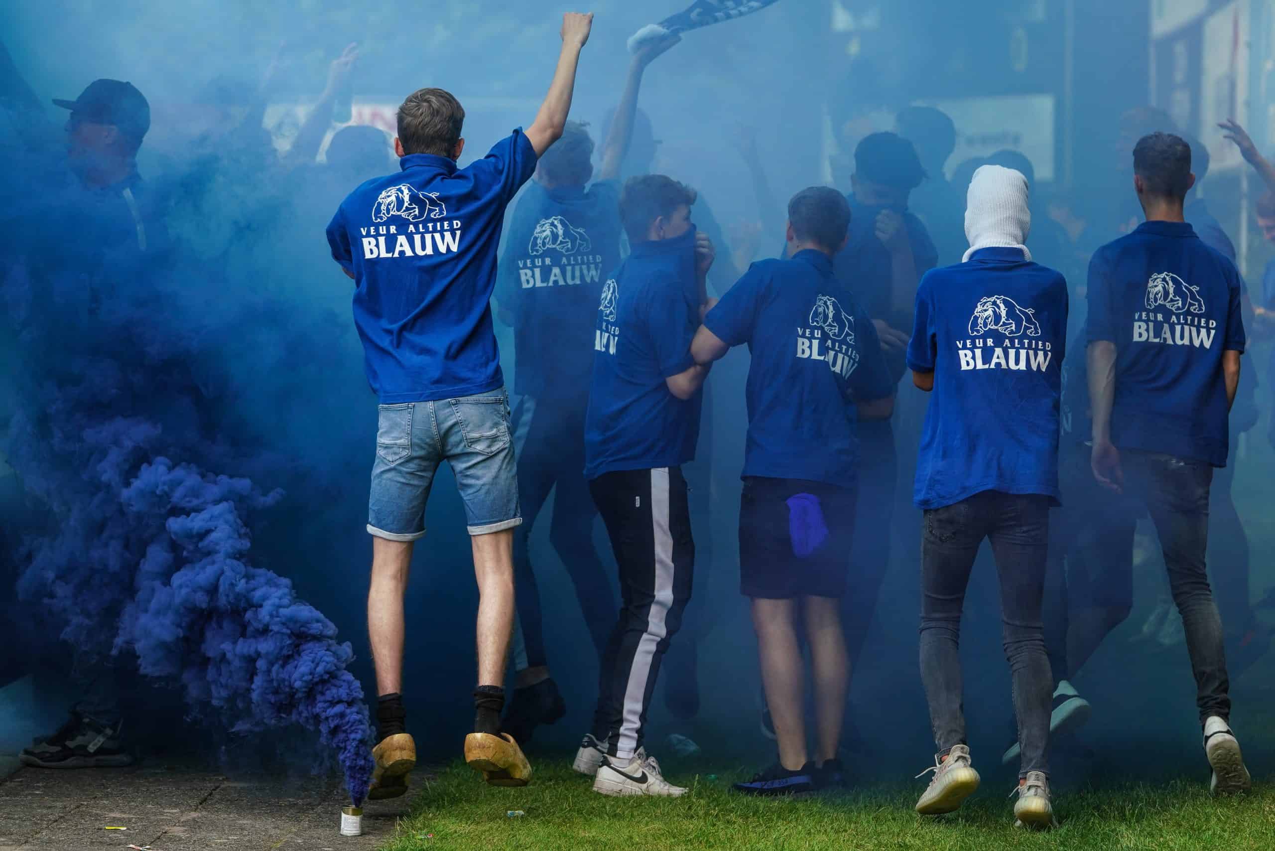 In de resterende tijd, aangevuld met enkele minuten extra, hangt de 1-3 meer in de lucht dan de 2-2. Als de scheidsrechter voor het laatst fluit springen de tientallen in blauw gehulde Ultras de boarding over. De gele dopjes knallen van de fakkels af en ze rennen richting juichende spelers. Een sliert rook achter zich latend. Onderweg naar de middencirkel lijkt het nog te ontsporen als een van hen tegen de keeper aan loopt. De keeper zet de achtervolging in maar het opstootje wordt snel gesust. Hij druipt teleurgesteld af terwijl het blauwe deel van de aanwezigen het feestje viert. Als hij zijn bidon uit zijn goal vist wensen wat blauwen hem succes in de tweede klasse. Hij reageert met: “dan kom ik jullie daar weer tegen” en draait zich om. Richting kleedkamer om met zijn teamgenoten de degradatie te verwerken.