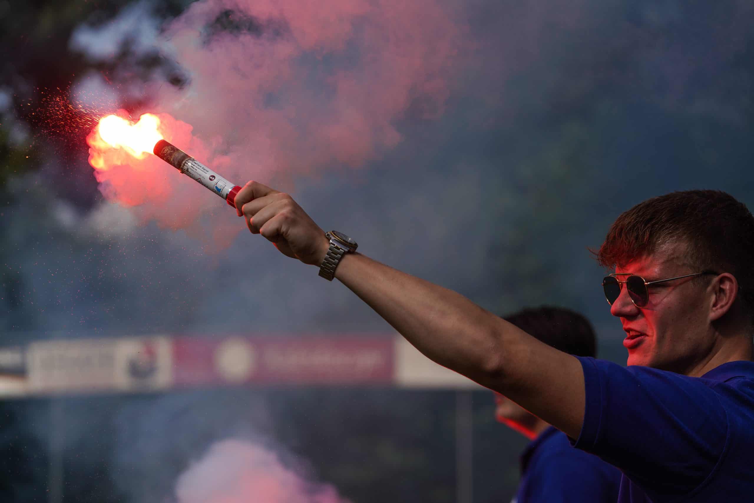 Twee minuten na de pyro stop staat het dan alsnog 1-1. Met een omhaal wordt de gelijkmaker tegen de touwen geschoten. De spelers springen een kluwen van juichende meegereisde fans tegemoet. Weer wordt er pyro ontstoken. Fakkels dit keer. Het startschot voor nog meer vocale steun. De groep achter de goal groeit ook als steeds meer ‘gewone’ supporters zich bij de fanatieke aanhang voegen. Het uitvakje ontploft weer als in blessuretijd de 1-2 wordt binnengewerkt. Terwijl heel Nijkerkerveen denkt DOS’37 te hebben uitgeschakeld beslist het arbitrale duo weer anders. Weer wordt er overlegd en weer wordt de treffer afgekeurd. We eindigen de wedstrijd met 1-1 en kunnen ons opmaken voor de verlenging.